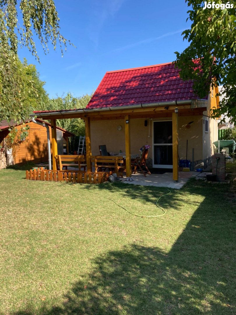 Eladó a Szelidi-tónál a víztől kb. 500 méterre lévő klímás nyaraló. Telek: 448 m2. Épúlet 46 m2. lakótér + terasz 15 m2. Víz, villany a házban. Két gk. fedett beálló + kerti faház. Alsó szint - előszoba, fürdőszoba, konyha + szoba egyben (klíma). Felső szint- szoba (klíma) .