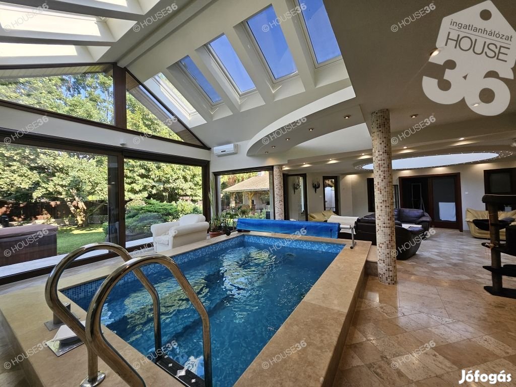 Kecskemét egyik legjobb utcájában, a Vacsiközben, 1166 m2-es dupla telken, kb.300 m2-es, tetőtér beépítéses, 2 nappali + 5 szoba + 2 fürdőszobás, igényesen berendezett és nívós anyagokból épült (mészkő, extra szigetelés), minden igényt-és extrát kielégítő luxus családi ház eladó!
