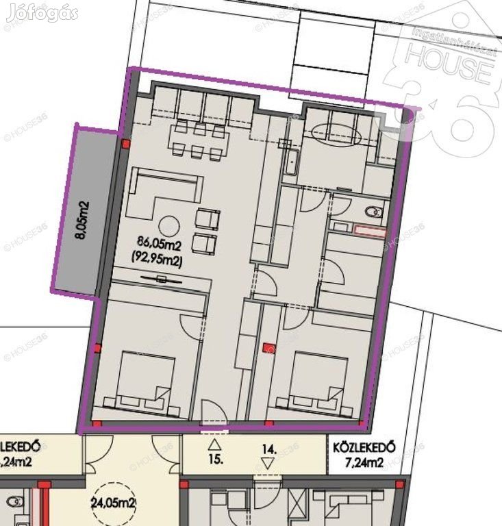 Az épület II. emeletén, bruttó 92,95 m2, nettó 86,05 m2 lakóterű, nappali + 2 szobás lakás, 8,05 m2 erkéllyel megvásárolható.