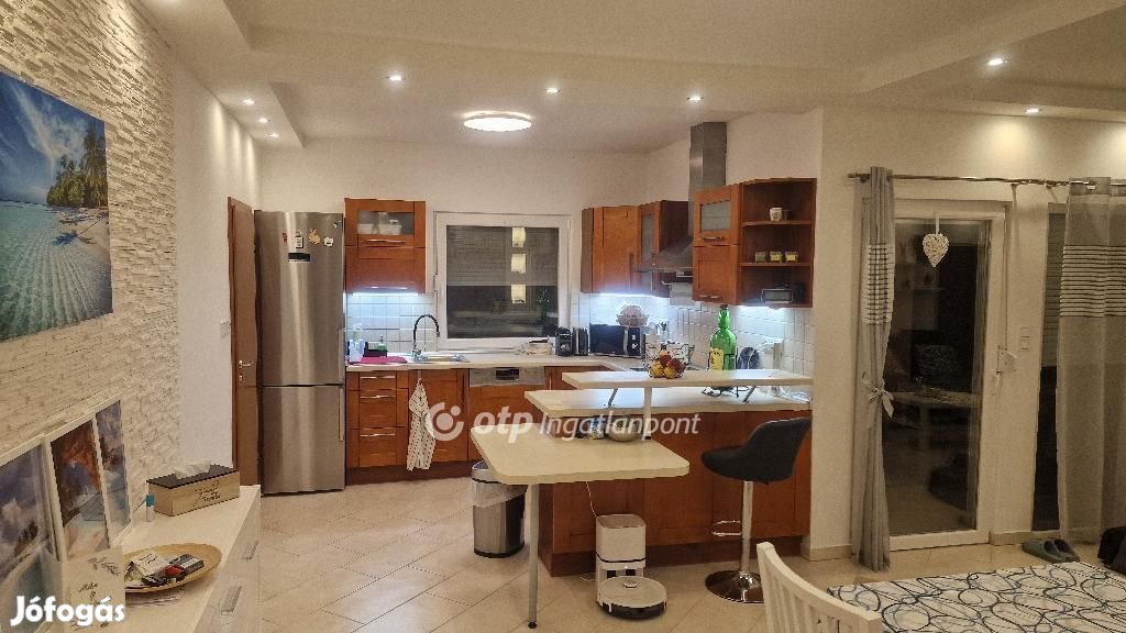 Csak a nappali+konyha rész 43 négyzetméter. Az innen nyíló terasz 14 négyzetméter. 2003-ban épült, kiváló állapotban van. 2 wc, 2 klímaberendezés van. A fürdőszobában kád és tusoló is van. A kényelmet még fokozza a mosó és gardróbszoba, a kamra, és a hobbi helyiség. Minden nyílászáró műanyagból van redőnnyel, és szúnyoghálóval. A tetőtér nem beépíthető, viszont nagy tároló lehet, mert fel lehet állni a magassága miatt. Az udvarban van egy műanyag kerti tároló ház a kerti eszközöknek. A házban riasztó, és kamerarendszer ügyel a biztonságról. Igény esetén teljesen berendezve is eladó. Budapesti 2 szobás garázsos lakás cserealapot képezhet a megegyezésben.