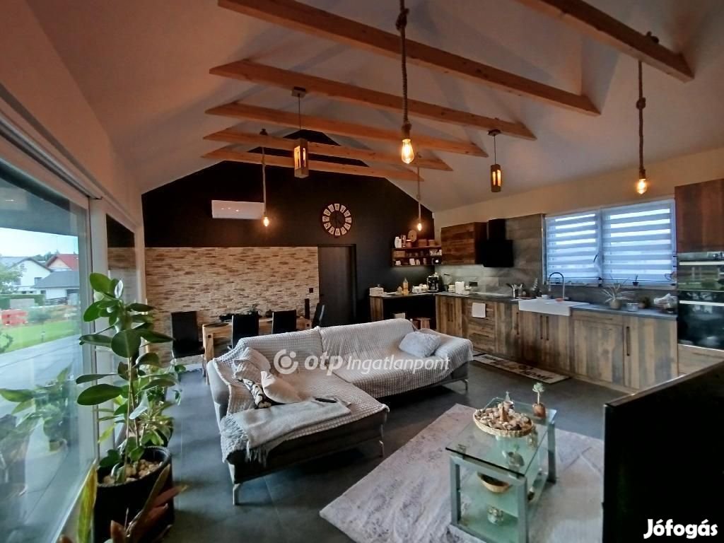 Ez a gondosan tervezet és modern stílusban kivitelezett otthon 1220 nm-en telken, nyugodt csendes környezetben. Könnyűszerkezetes nagy belmagassággal a nappali teteje szalufáig burkolva van. Melléképülete külön álló, 30 nm-es klímával, melyben jelenleg konditerem van. Nagy ablakok és tágas világos terek jellemzik.
