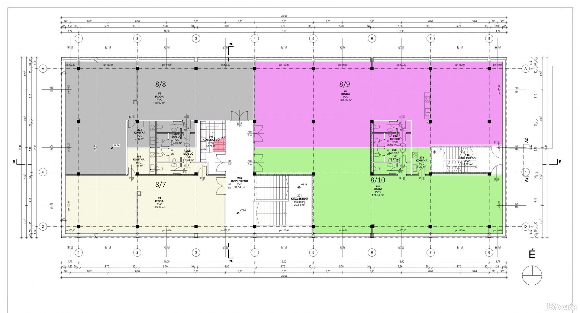 231m2-es iroda 3 falu nyílászárókkal , alumínium biztonsági bejárati ajtóval ellátva, hűtés-fűtés kiépítve, vizesblokk, konyhahelység külön szagelszívással kialakítva, összes iroda légcserélő berendezéssel ellátva, déli-keleti-nyugati oldalon zsaluzia kialakítva, kapus beléptetőrendszer, lépcsőházi pihenősarokkal , ital-snack-kávé automatával, teljes energiatakarékos LED világítással.