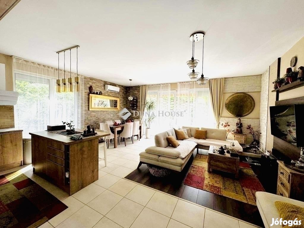 Toszkán életérzés itthon :medence, kerti tó, szauna ,varázslatos kilátás a Mecsekre.!!!!!!!!2008-ban épült, kiváló állapotú társasházi lakás .Ez a gyönyörűen felújított, egyedi stílusú, Amerikai konyha nappali, 2 szobás otthon tágas, amely ideális családi összejövetelekhez és baráti beszélgetésekhez.A lakásban vízlágyító berendezés működik, amely gázkazánra van kötve, így garantált a kényelmes és energiatakarékos használat.Egyedileg díszített emeleti fürdőszoba, káddal, WC-vel, az alsó szinten külön WC, tároló szoba a lépcső alatt.A szobák és a nappali is hűtő-fűtő klímával felszerelt, így a kellemes hőmérsékletet az egész lakásban érezni lehet.A mediterrán stílusú hátsó terasz igazi ékköve az ingatlannak: egy kis patak csordogál a kert végében, egy magasabb kert részben a medence, a grillezőhelyiség és a panorámás kilátás a Mecsekre pedig a nyugalom és a kikapcsolódás zálogai.A lakáshoz tartozik egy garázs (5.9M) elektromos kapunyitóval, a garázs mellett külön saját tároló, ahol a kazán és a vízlágyító berendezés is helyett kapott.Ha egy igazán különleges, jól karbantartott, pár hónapon belül költözhető ingatlant keres, akkor ezt látni kell!A jelenlegi tulajdonos kiváló lakberendezési ízlésének köszönhetően a lakás igazi különlegesség. A bútorok megegyezés tárgyát képezik.További kérdés esetén hívjon bizalommal