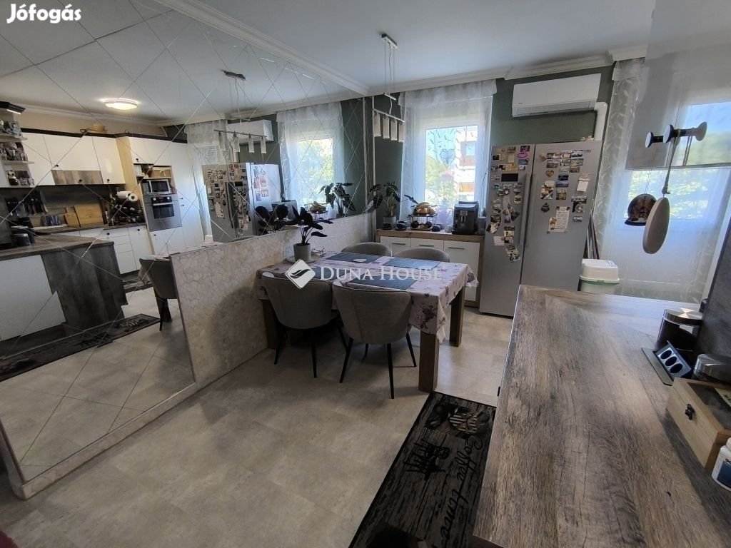 Eladó Pécsett-Rózsadombon a Fagyöngy u-ban egy 3. emeleti, 74nm-es, erkélyes, (3,5 szobás átalakított) 3 külön nyíló szobás panel lakás.A lakás teljesen felújított észak-déli tájolású.A konyha és a félszoba közötti válaszfal bontását követően egy nagy, 16 m2- es konyha - étkező lett kialakítva, modern bútorral, indukciós főzőlap + sütő és mosogatógép is van.Az épület szigetelt, műanyag nyílászárókkal ellátott. Fűtése távfűtés költségmegosztóval. Elrendezése kiváló nagy előszoba beépített szekrénnyel. A fürdő teljes körű felújításon esett át a megszokott egy csaptelep mellé beépítésre került egy kádtöltő zuhany váltós csaptelep is. Műanyag bejárati ajtó lett beépítve valamint a beltéri ajtók is cserélve lettek. A folyosón a konyhában étkezőben vinyl padló van. Szobában az eredeti laminált padlóra padlószőnyeg került. Minden ablakon redőny és szúnyogháló van. Az erkély tavasszal lett felújítva. Új szúnyoghálós redőny és padlóburkolat került ide is. Minden szobába és az étkezőbe tavasszal prémium kategóriás huzatmentes klíma lett telepítve.Az alagsorban van egy 2 lakás által használt nagy tároló is.Az ingatlan közelében buszmegálló (50m), bolt, posta, iskola, óvoda, orvosi rendelő, gyógyszertár található. A berendezési tárgyak alku tárgyát képezik.Amennyiben felkeltette érdeklődését, keressen bizalommal!