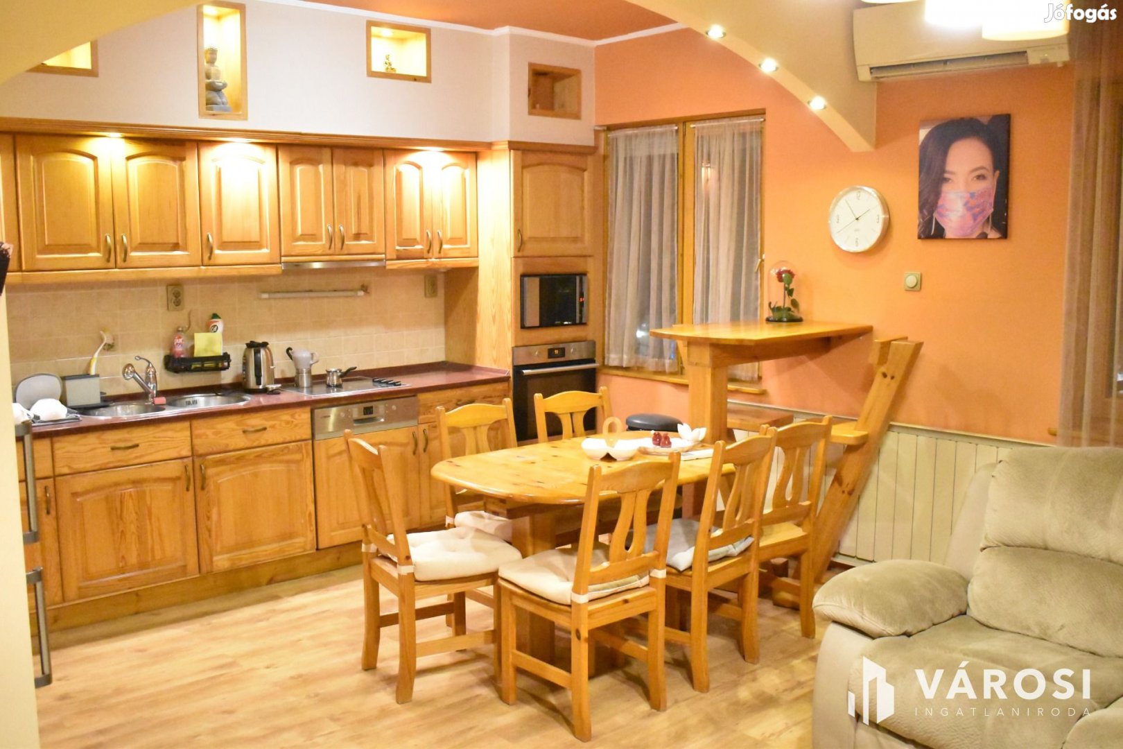 Eladó Gyula központi városrészen, a Kossuth téren egyedi panoráma kilátással rendelkező, szépen felújított 3 szobás, amerikai konyhás tégla lakás. Az ingatlant 2017 évben újították fel, mely során a konyha, fürdőszoba, közlekedő, Wc helységek szép hidegburkolatot kaptak, továbbá a nyílászárók is cserélve lettek új fa, hőszigetelt nyílászárókra. A lakás elektromos vezetékei is cserélve lettek (3 fázisra lett bővítve a hálózat, illetve H tarifa is van). A lakás fűtéséről egy modern Viessmann gázkazán és lapradiátorok, valamint egy inverteres (hűtő-fűtő) klímaberendezés gondoskodnak. Az ingatlan elektromos fűtése igen hatékony a H tarifás áramnak és a nagy teljesítményű klímának köszönhetően. Az ingatlan egyedi átalakításának köszönhetően a nappali és a konyha rész egy légtérben található, ahol egy nagyon szép, minőségi gépekkel ellátott konyhaszekrény található. A felújítás során több kényelmi eszköz is be lett építve, mint pl. elektromos redőnyök és költséghatékony led világítások. A lakás elosztása hibátlan, mivel az összes helysége a közlekedőről külön-külön megközelíthető. A lakáshoz tartozik egy felújított erkély is, amely csodálatos panorámával rendelkezik a város központjára. Az ingatlanhoz tartozik egy közös tárolóhelység. A lakás ára tartalmazza a teljes, minőségi bútorzatot és a beépített műszaki tárgyakat (MILE mosógép, mosogatógép, hűtőszekrény, bőr-dönthető ülőgarnitúra stb.)