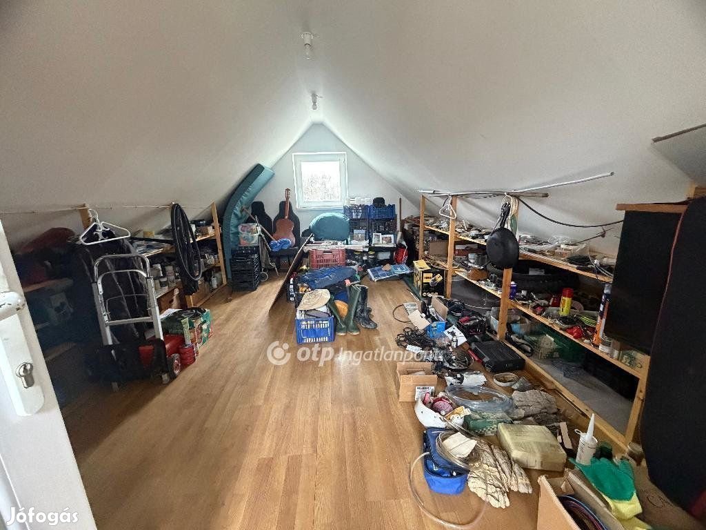 Az alsó szinten szoba, amerikai konyhás nappali, kamra és zuhanyzós fürdő wc-vel kapott helyet. A hálószobában faltól-falig beépített szekrény található. A felső szint még beépítésre vár vagy jelenlegi állapotában tárolásra alkalmas.