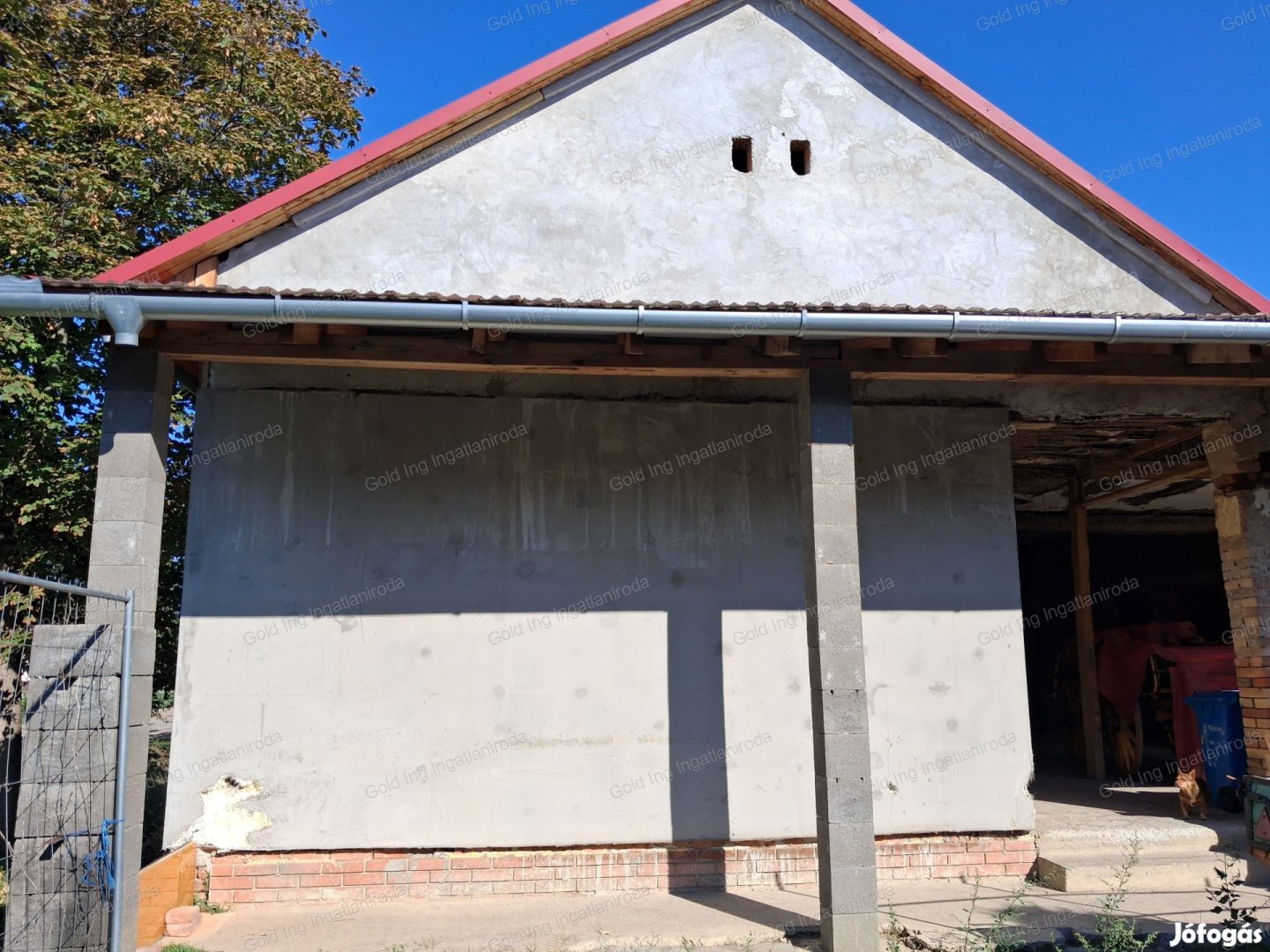 A hetvenes években épült polgári jellegű, vegyes falazatú ház, kiemelt, magas lábazaton áll. Elkezdődött, de félbemaradt a felújítása, átépítése. A külső homlokzatot részben újra vakolták és hőszigetelték. Az utcafronti két nagy szobára új műanyag ablakokat tettek. Egy szenzációs méretű és fekvésű, fedett, 82 nm-es terasz helyezkedik el az épület központi részén. A két szobán kívül, két további helység nyílik ugyanerre a teraszra, amit konyhának és fürdőszobának terveztek. A padlásfeljáró után következik, egy 7, egy 14, egy 16 és egy 2 négyzetmétres kamra, vagy tároló. Sok célra alkalmasak lehetnek, akár még egy lakás kialakítható bennük. Ezek a helyiségek egy 12 nm-es fedett folyosóról közelíthetők meg. A kiskaputól a hatalmas fedett teraszig, szintén száraz út vezet, egy 8 nm-es, fedett folyosón keresztül.