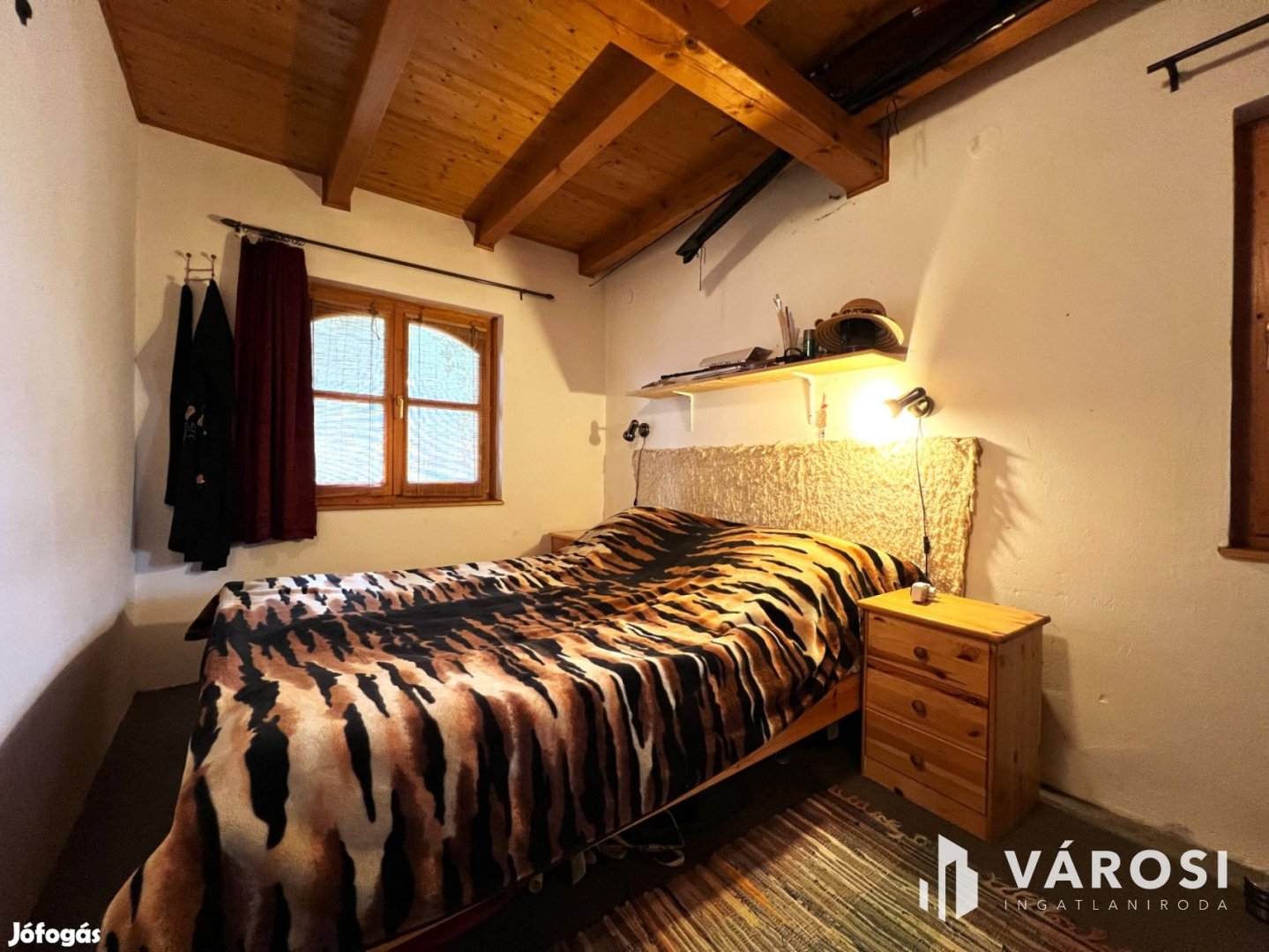 A természet közeliség megjelenik a házon belül is, sok faanyag került beépítésre, gerendázott mennyezete is az otthonosság érzetét növeli.