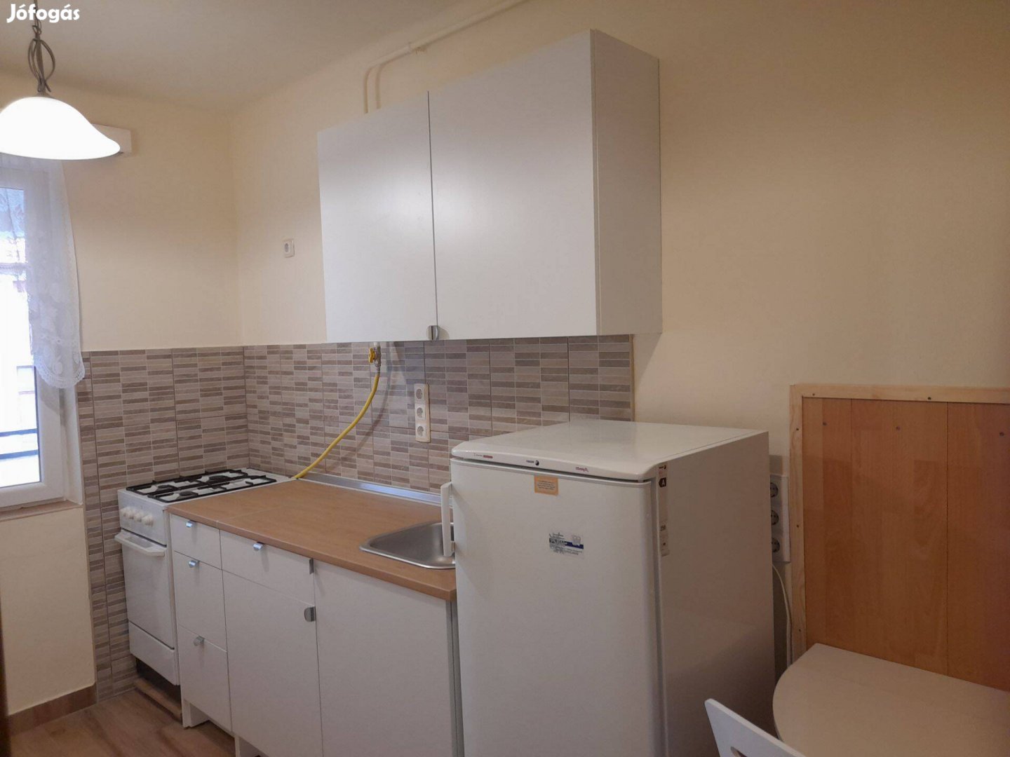 Egy szoba és a konyha berendezett. Gáztűzhely, hűtő van.