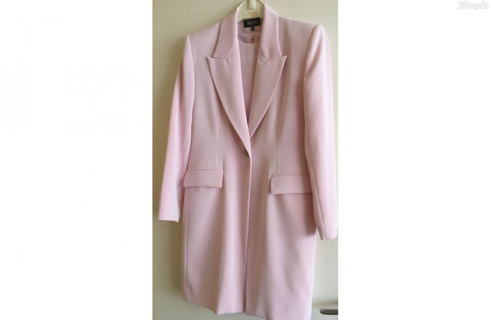 Elegáns 40-es púderrózsaszín együttes, ujjatlan, karcsúsított ruhával és hosszított (kabátszerű) blézerrel. Néhány alkalommal használt, hibátlan állapotban. A ruha hossza:88 cm; mellbőség 94 cm. A kabát hossza:90 cm; ujjhossz: 58 cm; vállszélesség 42 cm. Piké szerű, műszálas anyagból, gépben mosható.