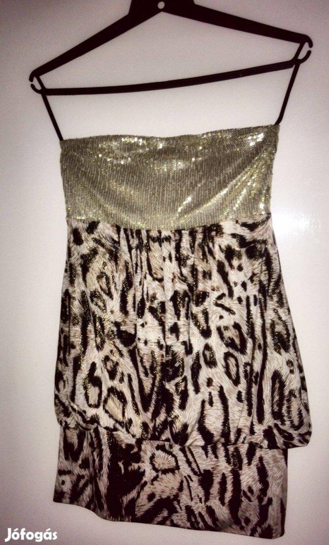 Barna leopárdmintás felül arany flitterekkel díszített pánt nélküli miniruha 34-es (XS-es) méretű, új állapotú 2800 Ft-ért eladó.
