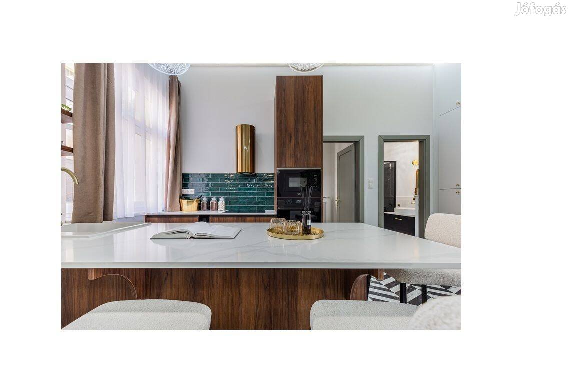 Az ingatlan teljes körűen bútorozott és gépesített, egyedi tervezésű bútorokkal, prémium burkolatokkal és motorizált redőnyökkel. Az energiahatékony működést hőszivattyús klímák, új kondenzációs kazán és melegvíz-tároló biztosítja. A tágas konyhaétkező, az erkélykapcsolatos nappali, a két hálószoba és a két fürdőszoba kényelmes, magas színvonalú életteret kínál.