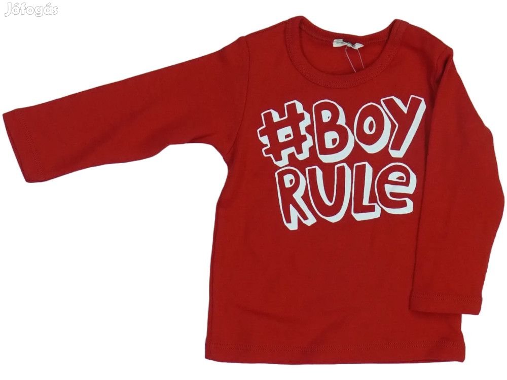 Piros hosszú ujjú felső fiúknak '#BOY RULE' felirattal. A puha pamut anyagú ruhadarab kényelmes viselet mindennapi használatra. A fehér színű nagybetűs feliratos minta vidám és trendi megjelenést kölcsönöz. Kerek nyakú kivitelezés, normál hosszúságban készült. Ideális választás aktív kisfiúknak, akik szeretik a színes és karakteres ruhadarabokat. Könnyen kombinálható farmerrel vagy melegítőnadrággal.