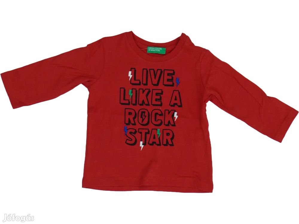 Piros színű hosszú ujjú felső fiúknak, mely kényelmes pamut anyagból készült. A ruhadarab elején nagy, feltűnő 'LIVE LIKE A ROCK STAR' felirat található fekete betűkkel, melyet színes díszítő elemek - villám motívumok és színes akcentusok - egészítenek ki. A póló környakú kialakítású, hosszú ujjú és normál hosszúságú. Ideális mindennapi viseletre, különösen azoknak a fiúknak, akik szeretik a zenét és a rock stílust. A Benetton márka minőségi kivitelezése garantálja a tartósságot és a kényelmet.