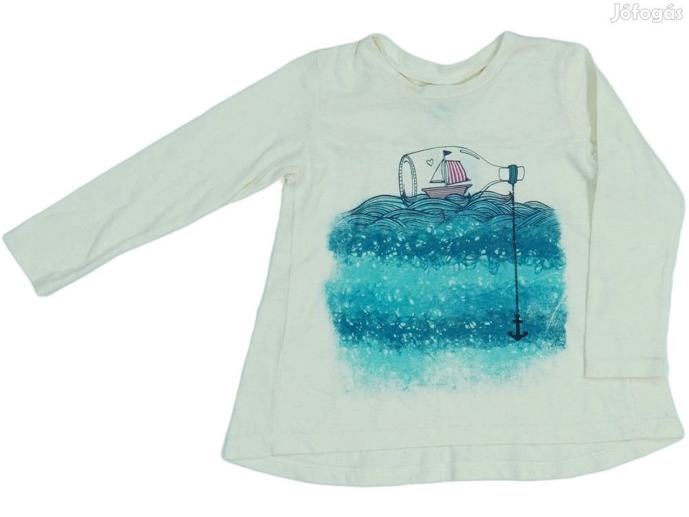 Bézs hosszú ujjú gyerek felső tengeri témájú mintázattal. A ruhadarab elején egy üvegbe zárt hajó látható, amely kék víz színátmenetben úszik, körülötte hullámokkal és horgonnyal. A design vízfesték hatású, álmodozó tengeri hangulatot kelt. A felső környakú, kényelmes, puha anyagból készült. Ideális választás kisfiúk számára, akik szeretik a tengeri kalandokat és a hajózást. A minőségi pamut anyag biztosítja a kényelmes viseletet egész nap.