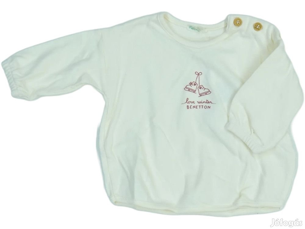 Hosszú ujjú baby felső világos krémszínű anyagból, puha és kényelmes viselettel. A mellrészen kedves téli korcsolya és 'love winter BENETTON' felirat díszíti. Vállán két gombbal könnyíti meg a fel- és levételt. Az anyag puha, ami rugalmasságot és kényelmet biztosít. Benetton márkajelzéssel ellátott, minőségi kivitelezésű darab.