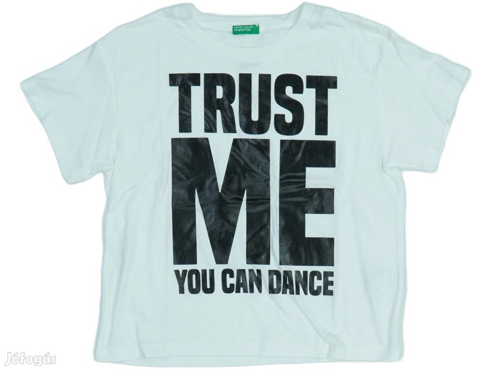 Csajos rövid derekú póló rövid ujjakkal és kerek nyakkivágással. A póló elején nagyméretű fekete nyomtatott felirat látható: 'TRUST ME YOU CAN DANCE' szöveggel, amely táncos témájú üzenetet közvetít. A 'ME' betűk különleges mintázott, fényes fekete anyagból készültek, ami vizuális kiemelést ad a designnak. A póló United Colors of Benetton márkájú, puha pamut anyagból készült, kényelmes viselet mindennapi használatra. Ideális választás aktív lányoknak, akik szeretik a motiváló feliratokat és a táncolást.