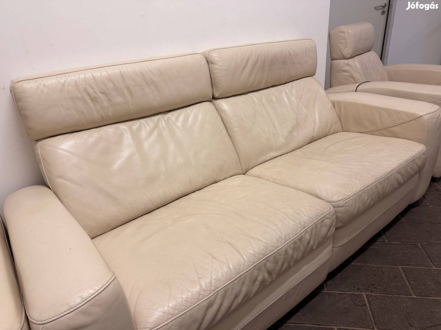 Eladó a képeken látható garnitúra, egy 3 részes kanapé, egy 2 részes kanapé kihajtható lábtámasszal és egy masszírozós fotel. A bőr nincs kirepedve, jó állapotú, egy festés kell neki, és újjá varázsolható. A XI. kerületből elvihető! Új ára 1M felett volt.