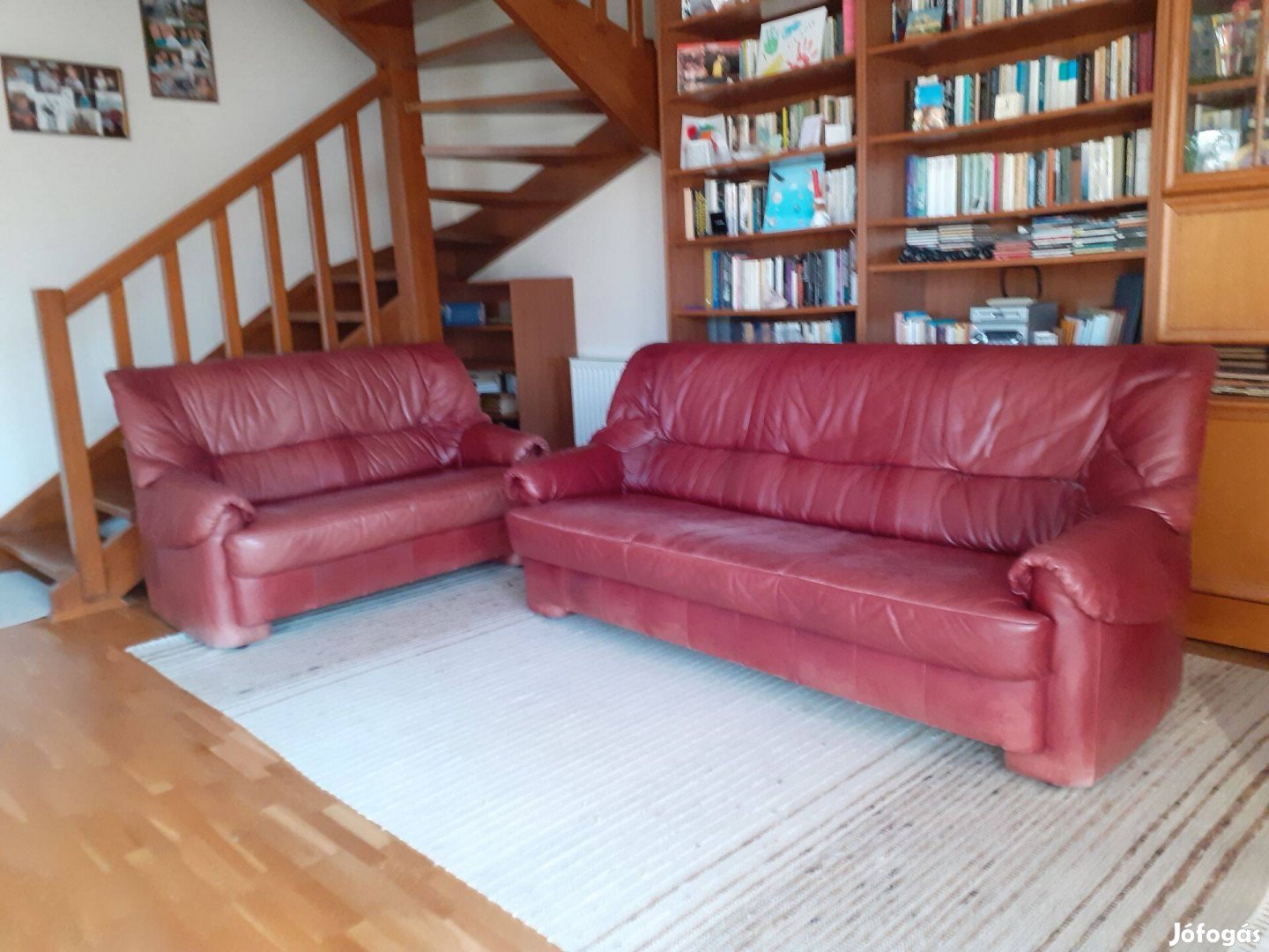 3 részes Bőr ülőgarnitúra, méretek (hossz/mélység/magasság): 3-részes kanapé:192/93/88 cm, 2-részes kanapé: 142/93/88 cm, fotel: 85/90/88 cm. Színe :meggy. Használt, de megkímélt, korának megfelelő, patinás. Békebeli európai minőség. A hátoldalak is bőrből készültek, így nemcsak falnál, hanem szabad térben is elhelyezhető.