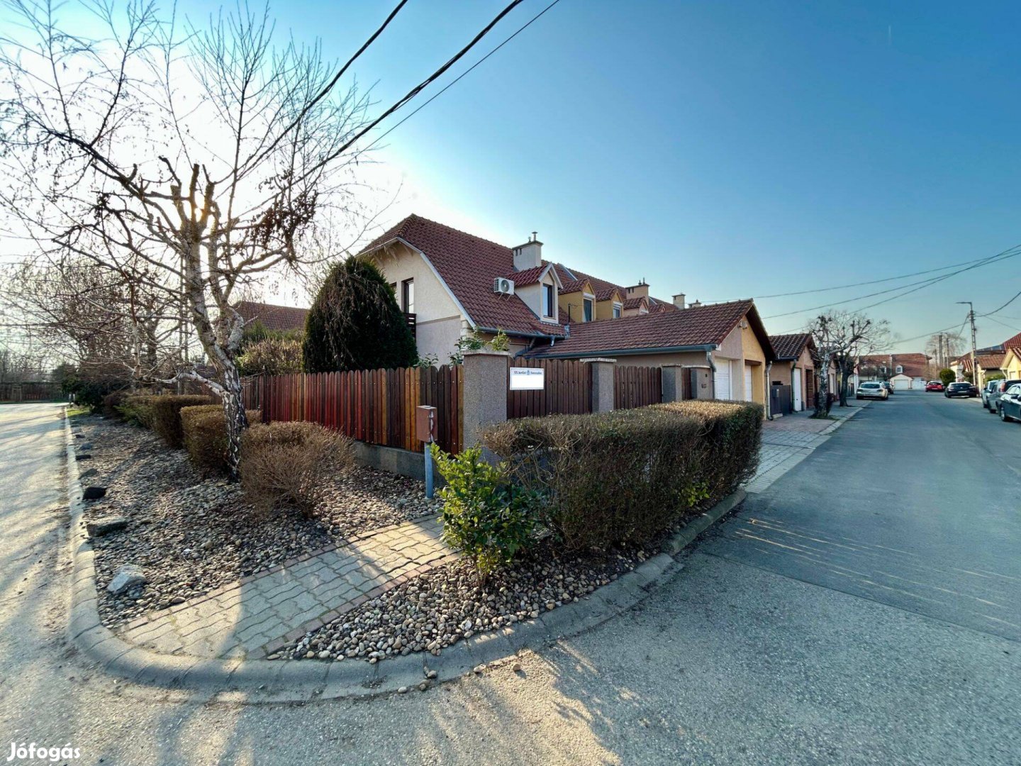 Az ingatlanba az elektromosan nyíló garázskapun vagy az előkerten keresztül juthatunk be. A garázsban van lehetőség elektromos autó töltésére is.
