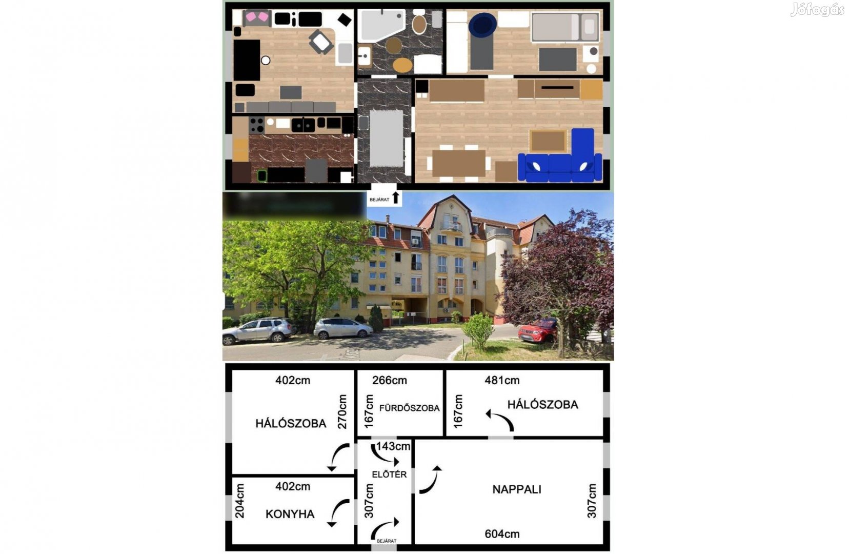 Felújított, 56 m2, egy + fél hálószoba (a nappalin kívül).