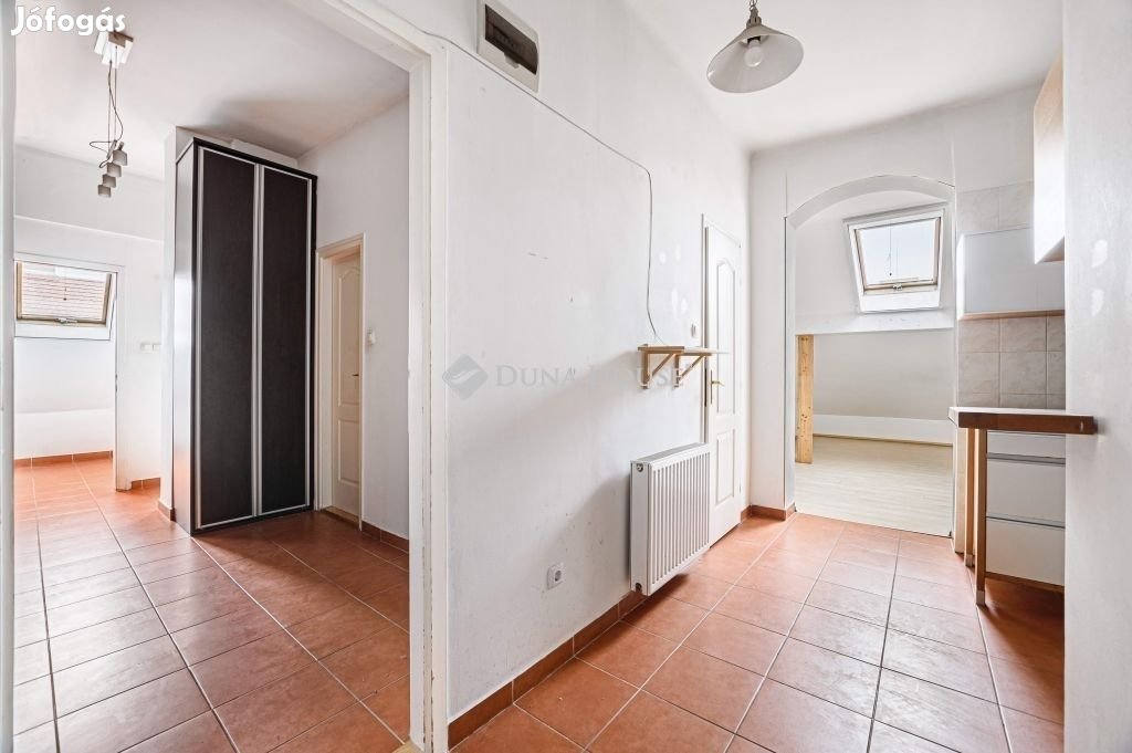A ház maga távfűtéses, azonban ez a lakás levált és egyedi gáz fűtéses. Netto 60 nm(ez szerepel a tulajdoni lapon is), a valóság azonban 73 nm tekintettel a tetőtéri 1.9 m alatti területekre. Az épületben a tetőszerkezet nemrég lett kicserélve. A ház anyagilag jól áll, a belső udvarban vannak gépkocsi beállók, de ezek várólistásak.