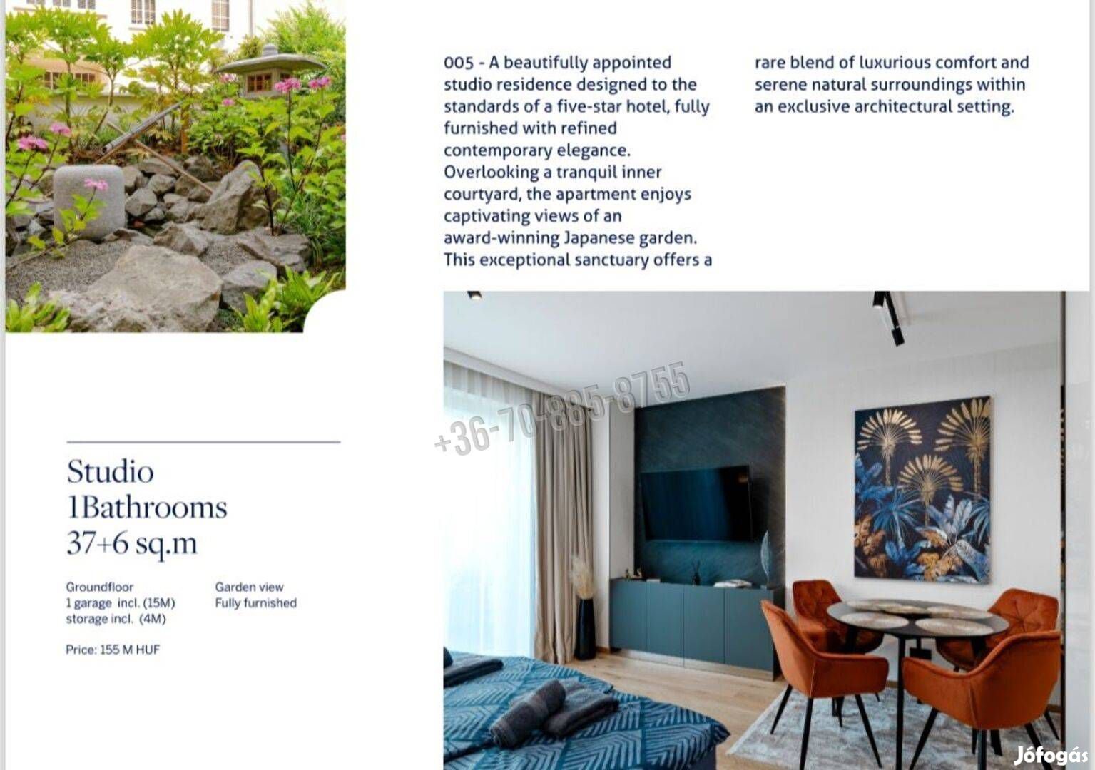 Az ingatlan földszinti elhelyezkedésű, csendes belső udvarra, valamint díjnyertes japán kertre néző kilátással rendelkezik. A lakás teljesen berendezett és gépesített, belsőépítész által megtervezett enteriőrrel, azonnal költözhető állapotban.
