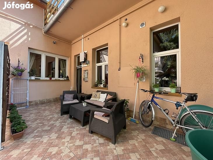 Újpesten, a piac közelében, frekventált, zöld fás utcában, 4 lakásos udvarban, eladásra kínálunk egy bruttó 210 nm-es, nettó 185 nm-es, belső kétszintes, 7 szobás, jó állapotú, téglalakást teraszkapcsolattal.