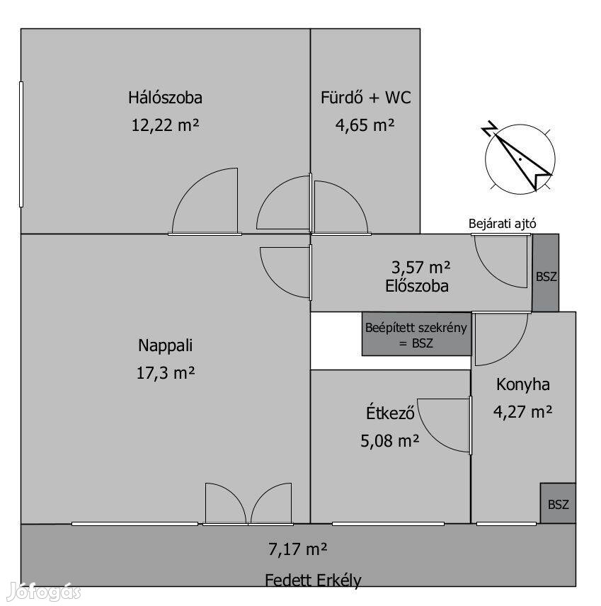 DNy-i fekvéssel: nappali (17,3m), étkező (5m), konyha (4,2m), erkély (7,1m)