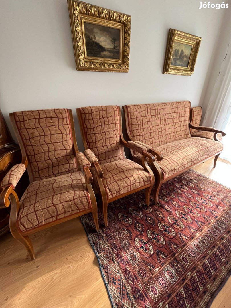 Tökéletes állapotú, újrakárpitozott ülőgarnitúra. 2 db karosszék, 2 db kartámasz nélküli szék, 1 db kanapé.