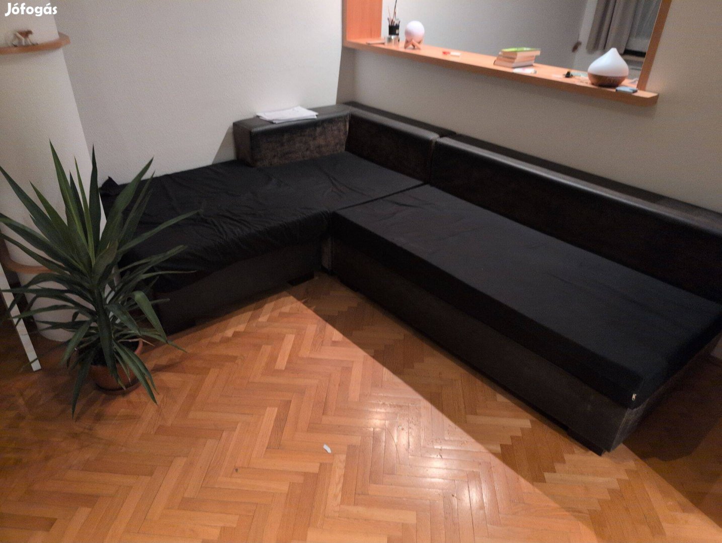 Sötétbarna bőr elemek, fekete ülőpárnák. 3 elemből áll (lábtartó, sarok, ülőrész). Az ülőpárnák vászonborításuak (külön lettek gyártatva egy éve), a lábtartó párnájának huzata véletlenül kicsit nagyobb lett (engem nem zavart, ezert nem szabattam kissebbre). Ennek a párnának van egy világosbarna bőrborítása is).