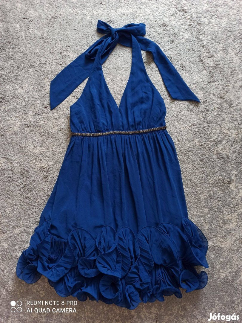 Különleges kobaltkék nyakba akasztós muszlin alkalmi ruha lefelé bővülő, az alján különleges pliszírozott, merevített a ruha, nagyon mutatós darab M-es méretű új állapotú 5000 Ft-ért eladó.