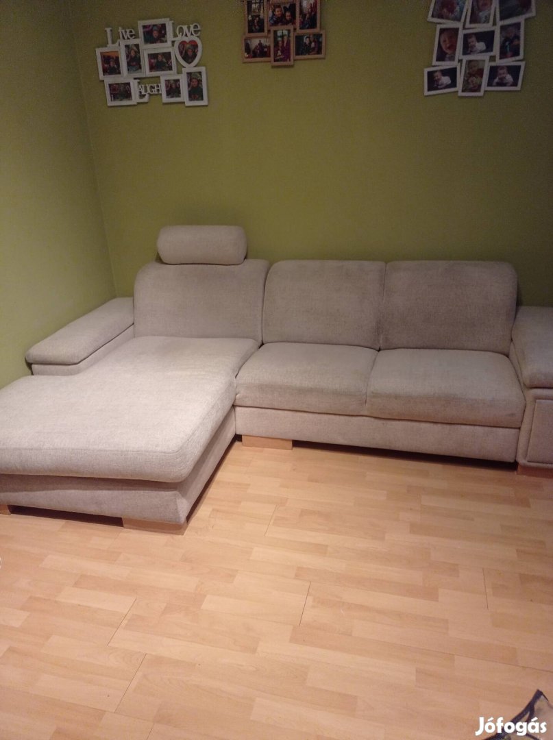 Eladó a képen látható L alakú kanapé. Kinyitható és ággyá alakítható, ágynemű tartóval. Kb. 270×170 cm. Érdeklődni a megadott telefonszámon lehetséges.