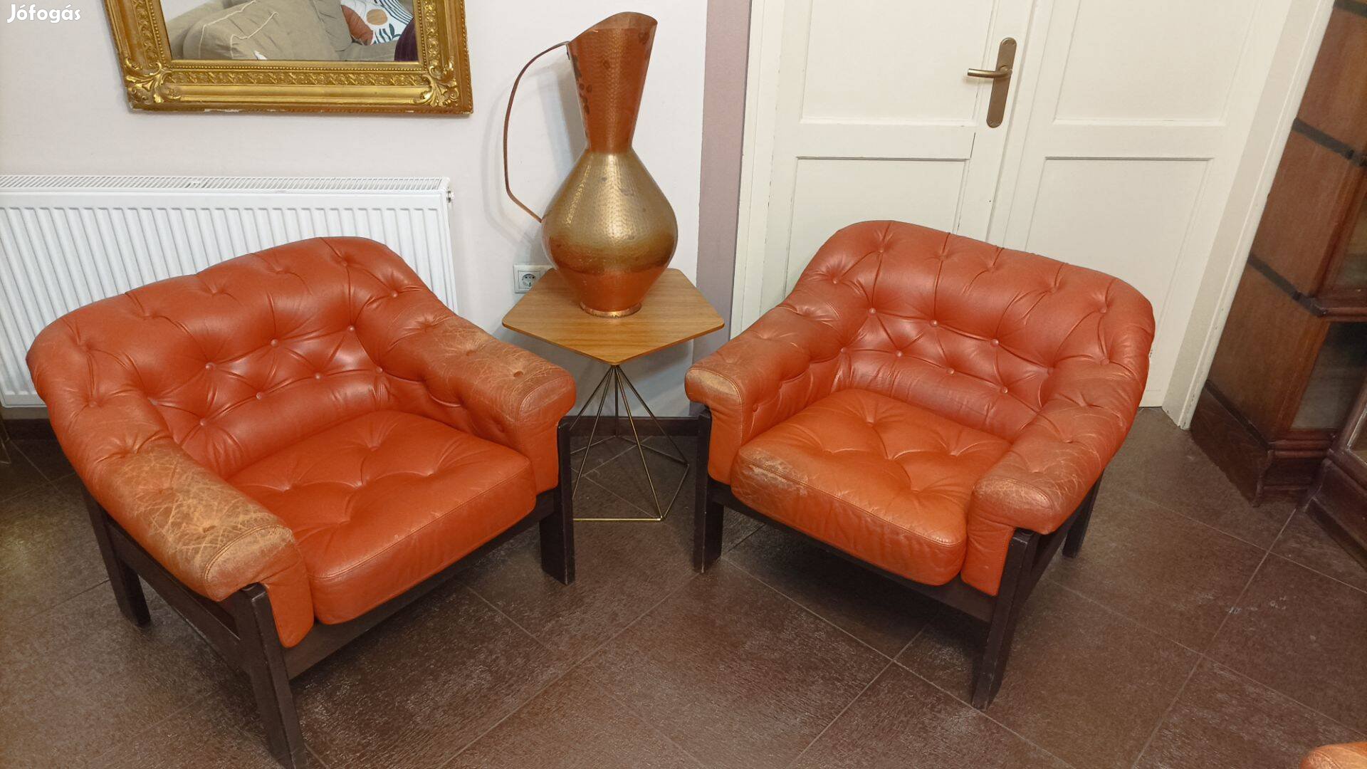 Mid century ,1960-70 es évekbeli, tűzőtt, chesterfield jelleg, terrakotta színű bőr ülőgarnitúra, ami kanapéból és 2 db fotelból áll, eladó.