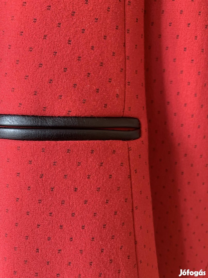 Vadonatúj, szép piros színű, zsebes blézer (zakó), enyhén karcsúsított, egy gombbal csukódó. Magyar termék, minőségi anyagból, minőségi kidolgozással. Emporiumban vásárolt, teljesen új, eredeti címkével, pót gombbal, még a zsebek sincsenek megnyitva. Fekete színű selyem béléssel, bőr (hatású?) paszpollal.