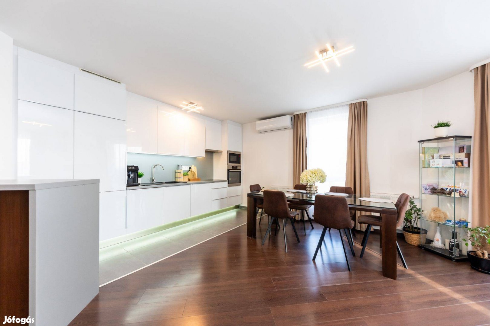 A tágas, amerikai konyhás nappali közvetlen kapcsolattal nyílik az erkélyre, ahonnan panorámás kilátás tárul fel.