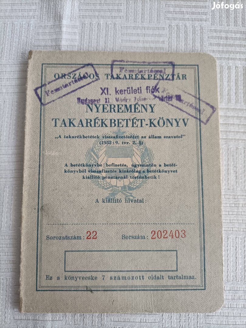 1962-ben nyitott otp nyeremény betétkönyv képen látható állapotban eladó