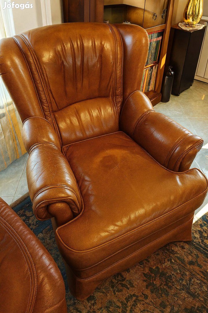 Masszív, időtálló darab, kényelmes kialakítással. A fotel használt állapotú, a fejtámlán egy folt látható.