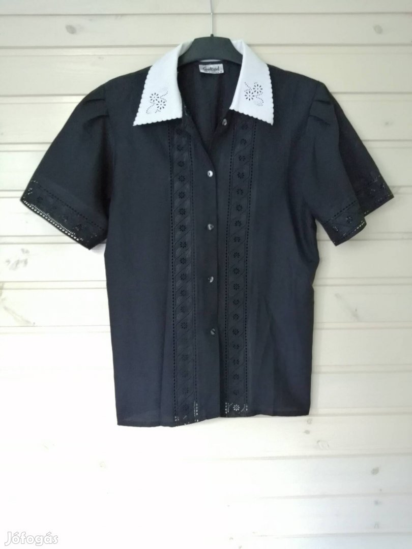 Fekete áttört virágmintás blúz fehér gallérral. M méret