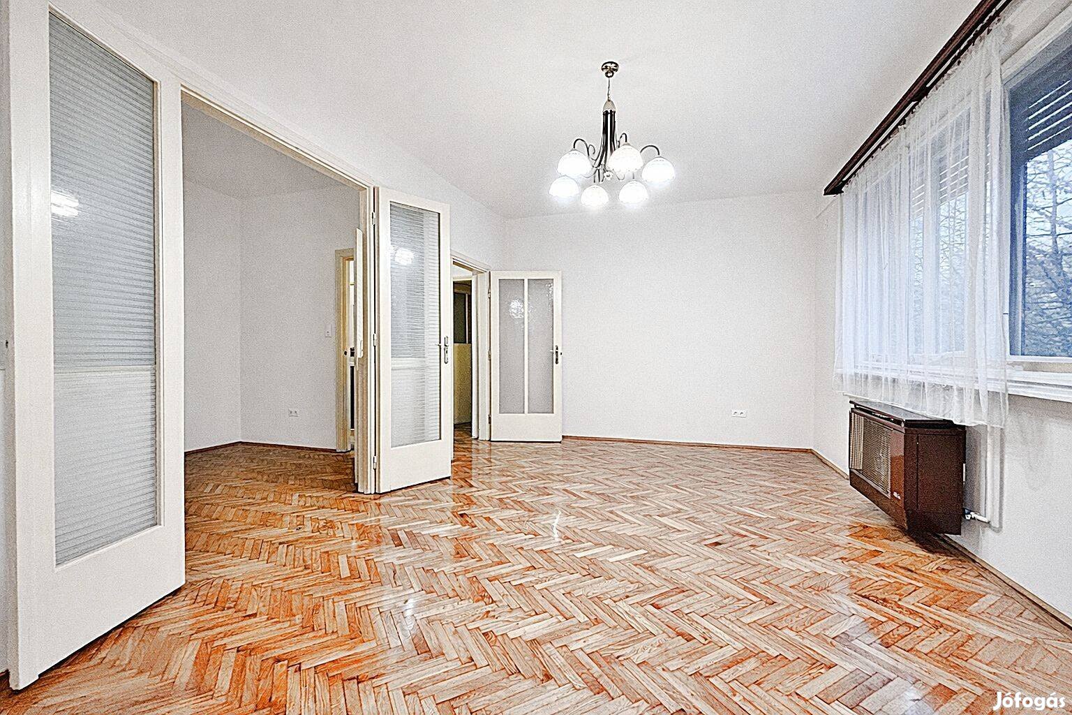 A 75 nm ingatlan, tágas Nappali, lezárható Hall, 2 különnyíló Hálószoba, ablakos Konyha, Kamra, Fürdőszoba, plusz mellékhelyiség, közlekedő elosztású, belmagassága 3 méter, magasföldszinti, Csendes belső kertre néző, Napfényes, Délnyugati fekvésű.