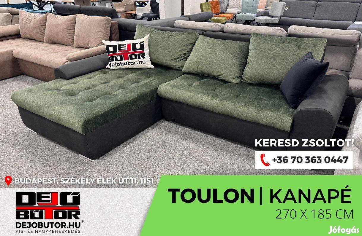Toulon kanapé ülőgarnitúra 275x185 cm sarok bútor zöld ágyazható ágyneműtartós 300.000 Ft fekvőfelület 140x20 cm