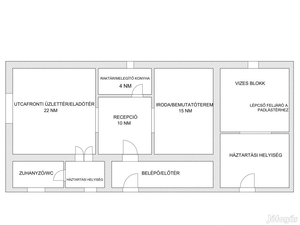 A lakható padlásteres épület alsó szintje 76 nm, igény szerint bővíthető. A melléképület 19 nm, önálló üzletként is működtethető.
