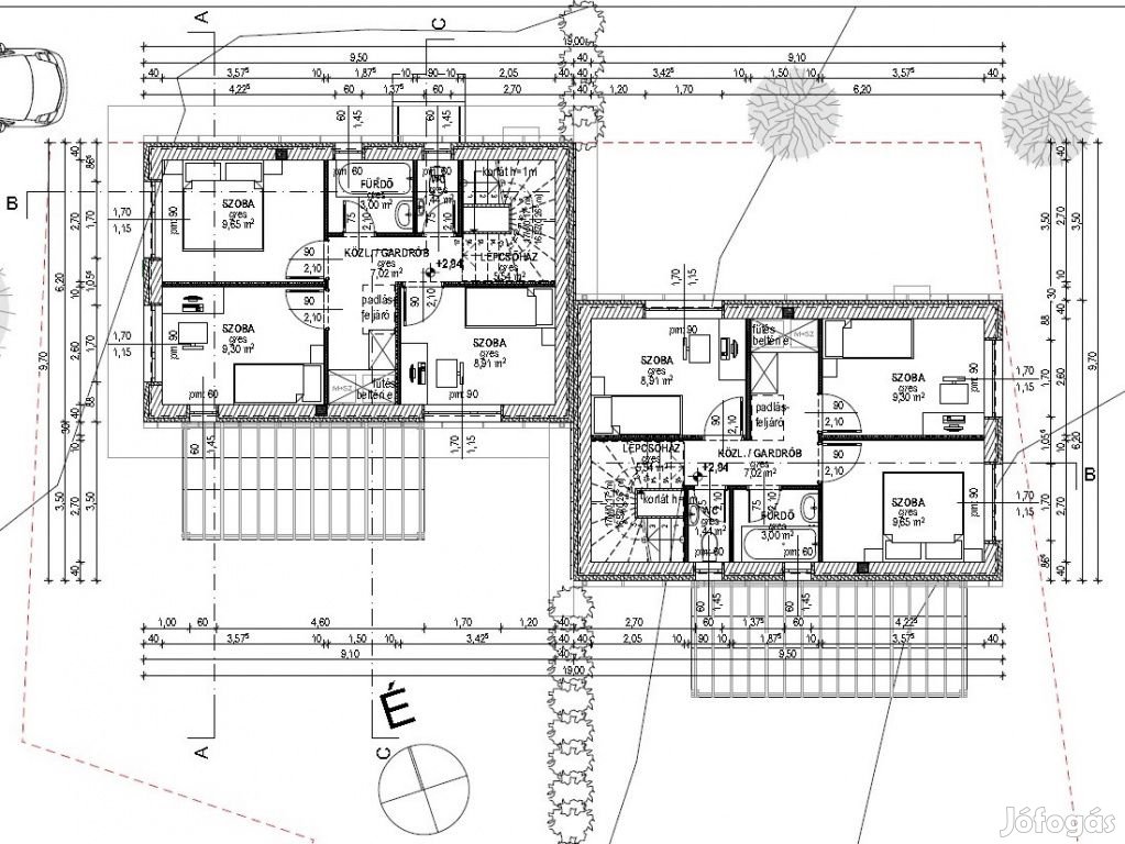 A két ikerház egymáshoz egyetlen szobaszakasszal csatlakozik, az eltolt kialakításnak köszönhetően a mindennapi élet zavartalan, az intimitás megmarad.