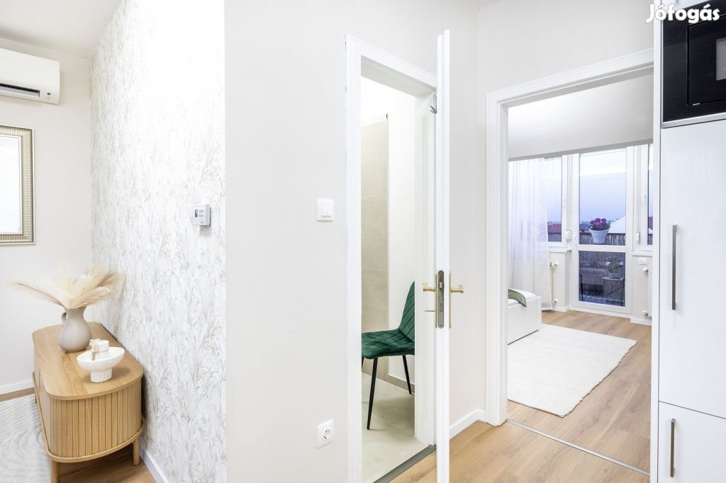 XIV. kerület, Zugló megújuló szívében: Örök Panorámás, Exkluzív, Dupla Erkélyes, a Citadellára és a Budai hegyekre Is kilátással rendelkező 2 külön szobás, Minőségileg Felújított, napos, külön Gardróbszobás Otthon, Garázzsal, Tárolóval, Liftes házban eladó a Bosnyák tér közelében.