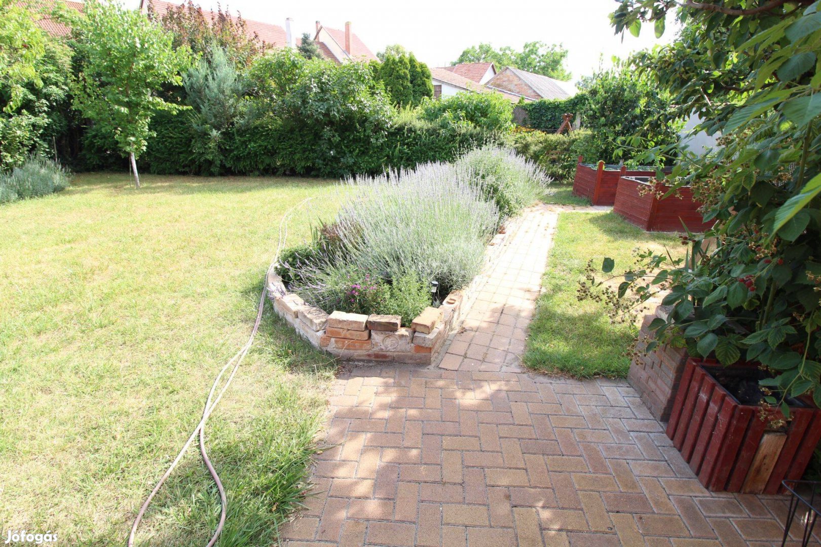 Pihenés céljára az udvaron igényes kerti kiülő és egy sütögetőhely is ki van alakítva. A 601 m2-es telek nagyrésze szépen gondozott fűvel, virágokkal borított, a kicsibejáró és kiülő környéke térkővel és betonnal burkolt.