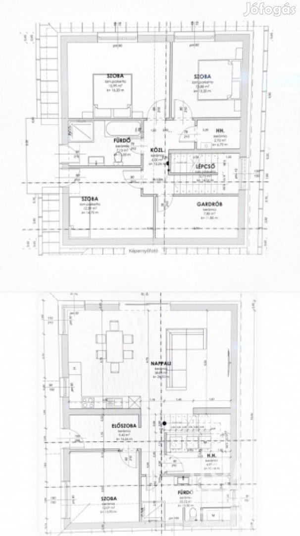 Emelet: 3 db hálószoba, gardróbszoba/hálószoba, fürdőszoba, wc, közlekedő, háztartási helység/gardrób