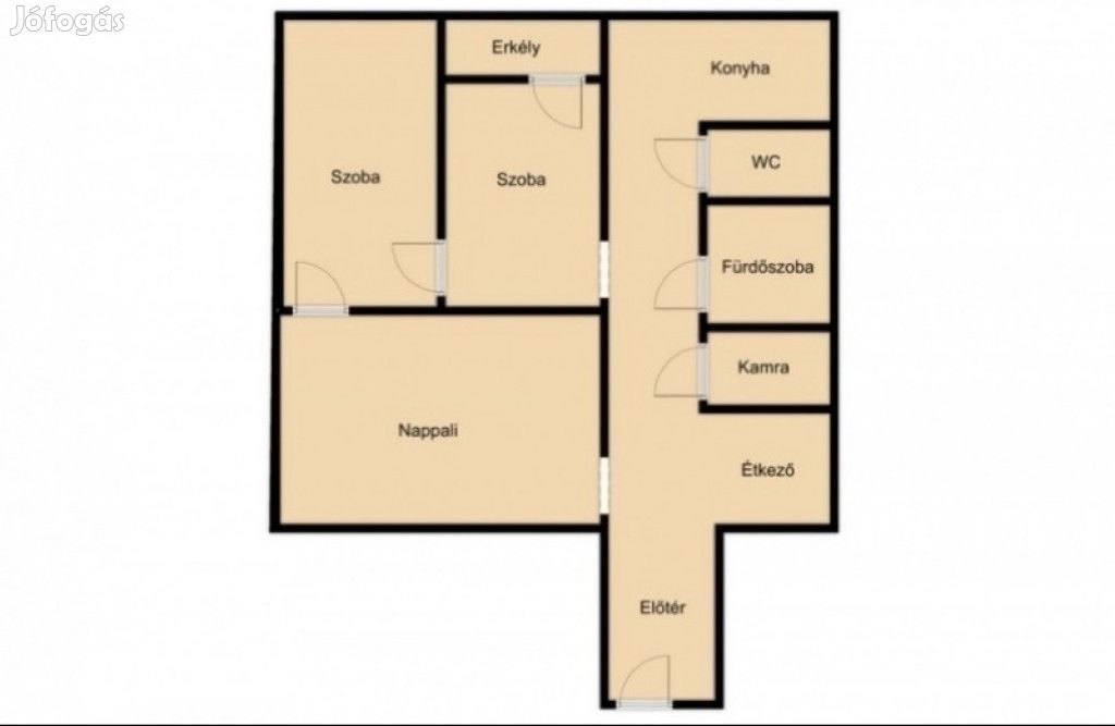 Elosztása: nappali, 2 db hálószoba, közlekedő, konyha, fürdőszoba, wc, kamra, erkély