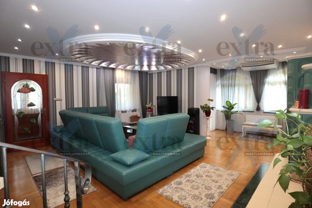 Gépkocsi tárolás: 33 m2 dupla garázs elektromos kapuval. A telken 16 m2 erdélyi faház, automata öntözőrendszer fúrt kúttal, parkosított udvar robotfűnyíróval és kutyakennel. Csendes utcában, ZÖLDÖVEZETI környezetben, jó közlekedéssel. Új építésű, igényes téglalakás beszámítása lehetséges.