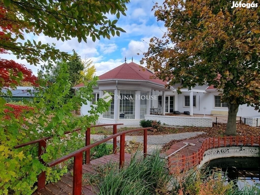 A birtok csodálatos, növényekkel, fákkal ültetett. A villa körül térköves járda visz körbe a kertben, kis híd, kerti tó, fedett pergola, veteményes ház, melléképület, tároló és térkövezett udvari beálló biztosítja több autónak is parkolást.