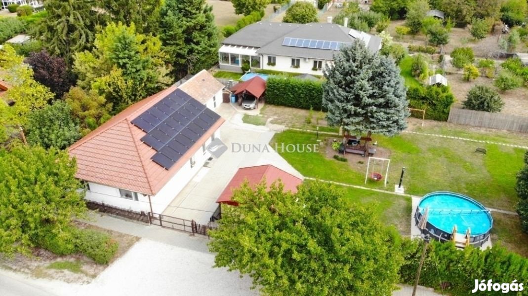 Eladó Gárdony-Dinnyésen 95 m2-es, (3 szoba + 2 fél szoba) felújított családi ház, 1243 m2-es telken.Felújítás 2021-ben történt:- Tetőcsere szigeteléssel, külső homlokzati szigetelés (15 cm), teljes elektromos vezeték csere.- Napelem rendszer (10 kW) kiépítése, új fűtéssel (4 db légkondíció, 4 db norvég panel). Ennek köszönhetően a ház villany és fűtési költsége minimális éves szinten!- A családi ház teljes belső szellőző rendszerrel rendelkezik.- Kamera rendszer, okos világítás.A telken fúrt kút, a garázsban szerelő akna van.Közművek: Villany, víz, csatorna, gáz a telken belül található.Vendégszoba fürdőszobával, külön bejárattal van kialakítva.A családi ház elhelyezkedése csendes, nyugodt környéken van.Székesfehérvár 15 km-re, M7 felhajtója 5 km-re található.Vételár: 93 millió Ft.Kérem hívjon bizalommal!